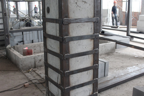 柱外包鋼加固法是以型鋼外包于混凝土柱兩角或四角,角鋼焊在扁鋼箍上,以增強(qiáng)其剛度和受力性能的加固方法,在框架柱的加固中使用較為廣。柱外包鋼加固法分為干式和濕式兩種,干式加固是在角鋼和原柱之間無(wú)任何連接,或者雖塞有水泥砂漿仍不能確保結(jié)合面剪力有效傳遞,角鋼與柱之間的變形難以協(xié)調(diào)。濕式加固是在角鋼與原柱之間采用乳膠水泥、聚合物砂漿或環(huán)氧樹脂化學(xué)灌漿等方法,使之達(dá)到型鋼與柱能夠整體工作、共同受力。干式外包加固施工簡(jiǎn)單,但濕式外包加固在承載力提高方面效果明顯,因此在實(shí)踐中濕式外包加固應(yīng)用較為廣。